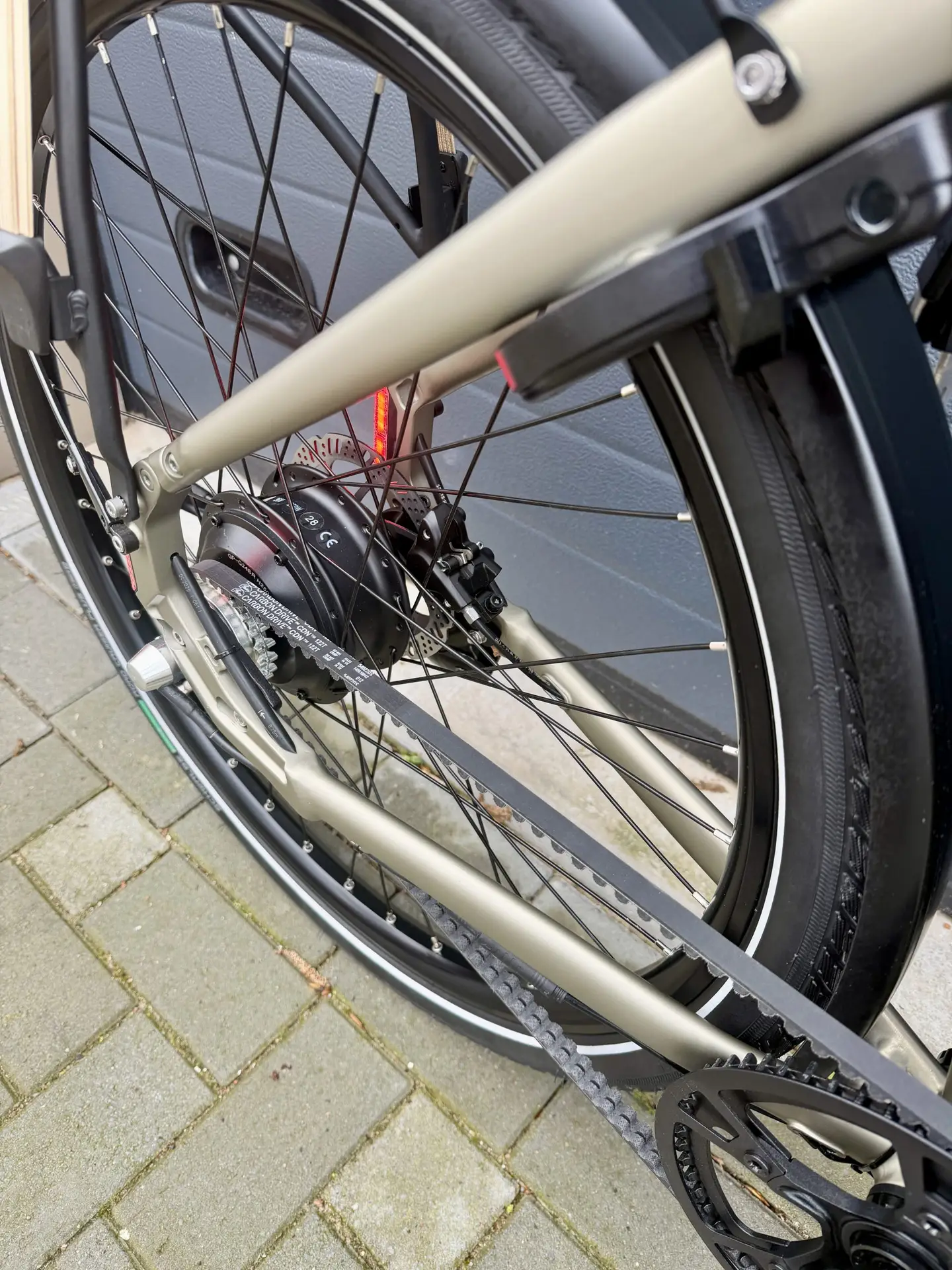 De stille achterwielmotor en riemaandrijving zorgen voor weinig onderhoud en een strakke look. Geen ketting, geen vet, gewoon rijden.