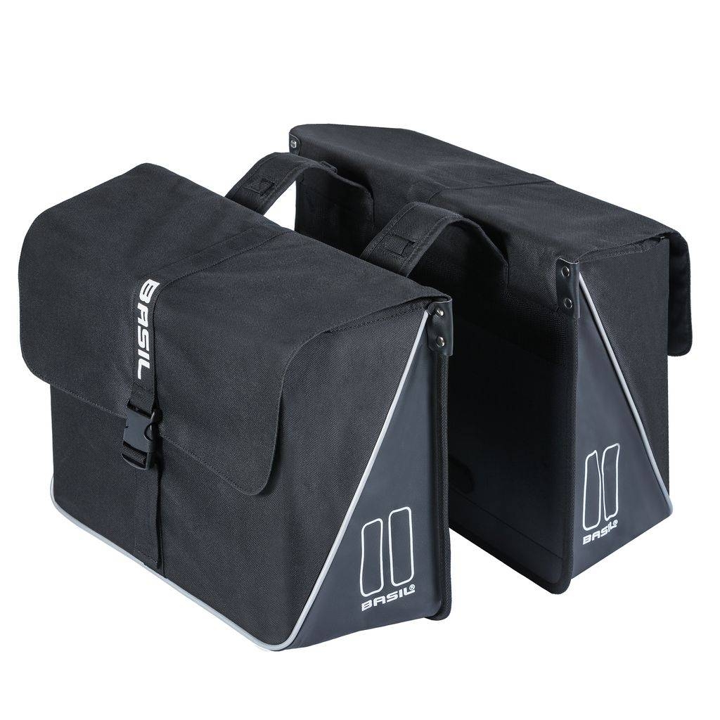 Met de ruime Basil Forte double bag heb je met een inhoud van 35 liter altijd genoeg ruimte bij je voor al jouw boodschappen. Deze stevige tassen zijn uitgevoerd in het zwart. De Basil Forte Double bag is een praktische dubbele fietstas waar je veel boodschappen in mee kunt nemen. Handig voor als je na je werk nog even snel de boodschappen voor de avond wilt halen. De tas is gemaakt van waterafstotend polyester in combinatie met tarpaulin. Daarbij heeft de tas een extra stevige constructie. Een echte krachtpatser dus! De Forte Double bag is voorzien van een aansnoerband en verstelbare sluiting. Dankzij de reflectie op alle zijden én een extra lange reflective piping, ben je beter zichtbaar in het donker. Je bevestigt de dubbele fietstassen makkelijk achterop jouw fiets met het Universal Bridge system. Ook op de bagagedrager van je elektrische fiets. Het systeem maakt het mogelijk om de tas op drie manieren te bevestigen: Vaste montage: met behulp van de meegeleverde riempjes.