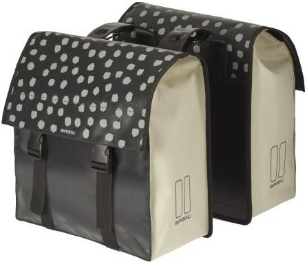 De Basil Urban Load is een regenbestendige dubbele fietstas voor achterop de fiets met het Basil Universal Bridge systeem, heeft een inhoud tot 53 liter en zwart met lichte reflecterende stippen. De Basil Urban load fietstas is een dubbele fietstas die door het (reflecterende) stippenpatroon lekker vrouwelijk en stijlvol oogt. De fietstas is onder andere gemaakt van polyester en waterafstotend tarpaulin. Zo blijven je spullen droog bij een regenbui, als je de boodschappen gaat doen of een rondje maakt door jouw bruisende stad. De vouwsluiting voorkomt het inregenen. De dubbele fietstas heeft een ruime inhoud tot maar liefst 53 liter. Soms best handig ingeval je met een tas vol nieuwe kleding thuis komt (oeps), in plaats van alleen die nieuwe schoenen die je écht nodig had. Als de tas leeg is, is deze compacter of smaller te maken door de flexibele zijkanten. Hierdoor kun je jouw fiets makkelijker kwijt kan in die overvolle fietsenstalling bij het station. De Urban Load is voorzien van het Basil Universal Bridge System waardoor deze op alle bagagedragers past (ook e-bikes) en gecombineerd kan worden met bevestigingssystemen als Racktime en i-Rack/Carrymore. Bovendien is er een model met reflecterende print, voor nog meer zichtbaarheid. De Basil Urban load is in meerdere kleuren beschikbaar, gebaseerd op de colorblock trend. Zo is er een groen met witte variant, grijs met (goud)geel en een zwarte Basil Urban Load tas. Neem hier eens een kijkje voor de gehele Basil Urban Load collectie. Eigenschappen: