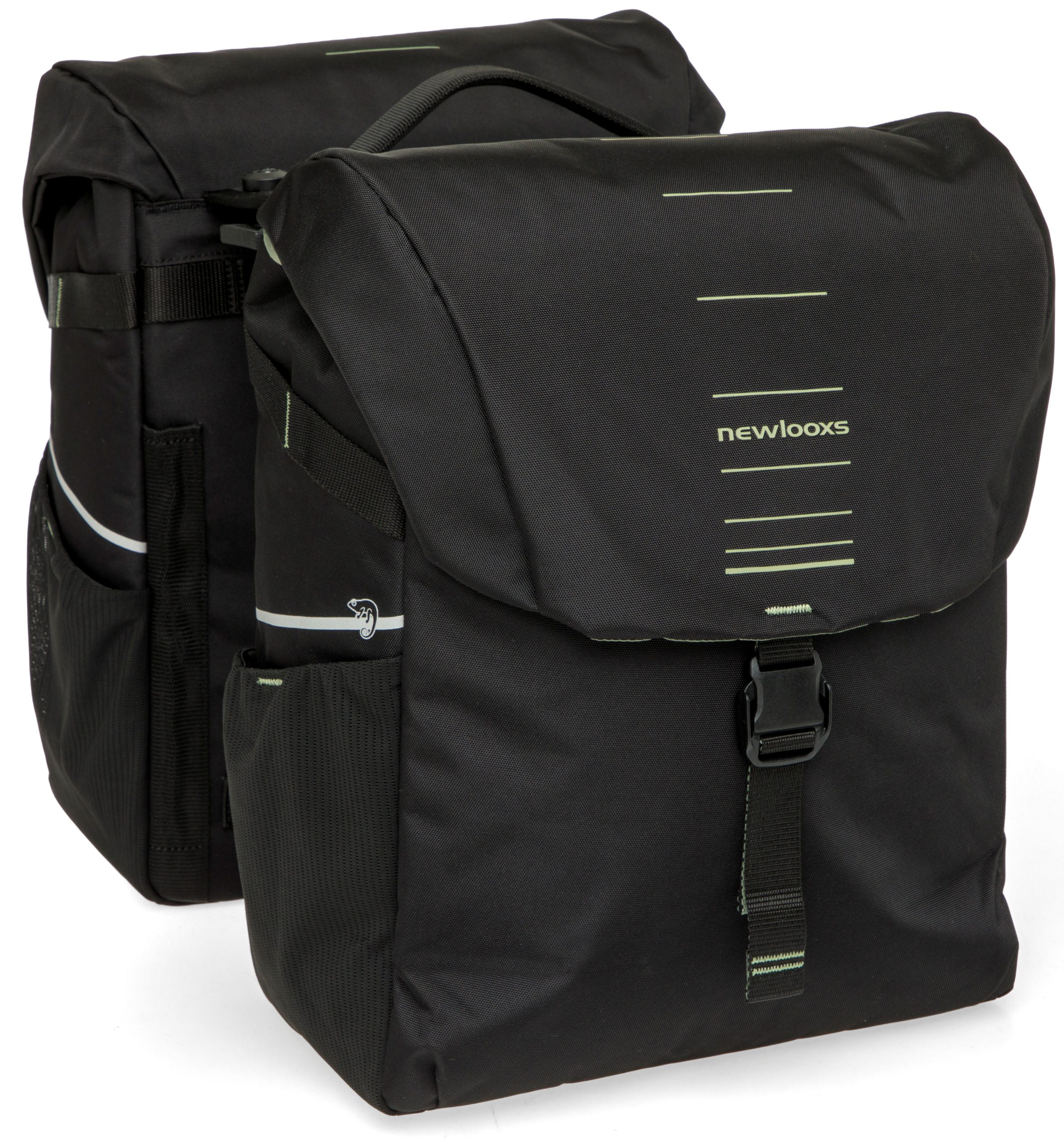 Deze populaire tas is vernieuwd en heeft een frisse look gekregen. Kan iets dat al heel goed is, nóg beter worden? Wij denken van wel! De Vigo Double is een degelijke dubbele fietstas met een sportieve uitstraling. De kleuraccenten op de tas geven de tas een frisse look. Met een handig formaat is deze moderne tas perfect voor dagelijks gebruik. Deze tas is geschikt voor fietsen met een MIK bagagedrager. De dubbele tas beschikt over 2 hoofdvakken en 3 extra vakken. Vigo is gemaakt van gerecycled polyester, een bewustere keuze. De bijgeleverde regenhoes zorgt ervoor dat alles droog blijft. Praktisch en sportief design Wie veel kilometers maakt, mag hoge eisen stellen aan een fietstas. De Vigo Double heeft veel praktische kenmerken. De hoofdvakken van de tas sluit je met een aansnoersluiting. Vervolgens sluit je de klep eenvoudig met kliksluitingen. Deze sluitingen van deze tas openen en sluiten extra makkelijk. Fijn als je je handen vol hebt met boodschappen, of last hebt van bijv. reumatische klachten. De tas heeft 2 ruime hoofdvakken, elastische zijvakken en 3 extra vakken. Zo neem je alle spullen goed georganiseerd mee. Eenvoudige bevestiging met MIK 2.0 De Vigo dubbele fietstas met MIK 2.0 adapter past op MIK bagagedragers. Kijk dus even goed of jij een bagagedrager met MIK-systeem op jouw fiets hebt. Heb je dit niet, dan kun je gebruik maken van een MIK Carrierplaat die je op je bagagedrager bevestigt. De tas heeft een voorgemonteerde MIK 2.0 adapter en wordt geleverd met 2 sleutels waardoor je de tas heel snel op de bagagedrager kunt klikken. Wil je de tas weer van de fiets afnemen, dan kan dit met 1 handbeweging. De kleine sleutel is geschikt als je de tas regelmatig meeneemt en dus van de bagagedrager afhaalt. Deze sleutel is uitschuifbaar en dus langer dan de kleine versie. Deze grotere sleutel is speciaal ontwikkeld voor grotere accessoires, die op de fiets blijven zitten. Je kunt dus kiezen welke sleutel je gebruikt, afhankelijk van of de tas op de fiets blijft zitten, of deze regelmatig van de bagagedrager wordt afgenomen. Het voordeel van het MIK bevestigingssysteem is dat de tas altijd goed bevestigd is op de bagagedrager. Daardoor blijft de tas goed zitten en hangt deze altijd mooi recht. Je kunt de fietstas extra vastzetten aan de zijkant van de bagagedrager met een klittenband riempje. Veilig onderweg De Vigo Double is stevig en vormvast door de kunststof platen in de bodem en achterwand. Daarnaast is de fietstas extra verstevigd met foam. Daardoor blijft de tas goed in vorm en kun je makkelijk je spullen in de tas stoppen. De dubbele Vigo fietstas is gemaakt van waterafstotend gerecycled polyester. Doordat de klep over de tas heen valt, is de tas goed waterafstotend voor kleinere regenbuien. Deze tas wordt geleverd mét bijpassende regenhoes. Zo heb je deze altijd bij de hand en maak je de tas 100% waterdicht. De tas is afgewerkt met reflectie voor extra veiligheid in het donker. Op de zijkanten van de tas zitten bandjes waar je eenvoudig een ledlampje op kunt bevestigen voor extra zichtbaarheid Afstandhouder Je kunt bij de tas een New Looxs afstandhouder gebruiken, deze is separaat te koop. Deze voorkomt dat de tas tegen het wiel aan komt. Je steekt de afstandhouder in de insteekstrips op de achterkant van de fietstas. Dan blijft de tas, ook zwaar beladen, altijd netjes recht op de bagagedrager hangen.