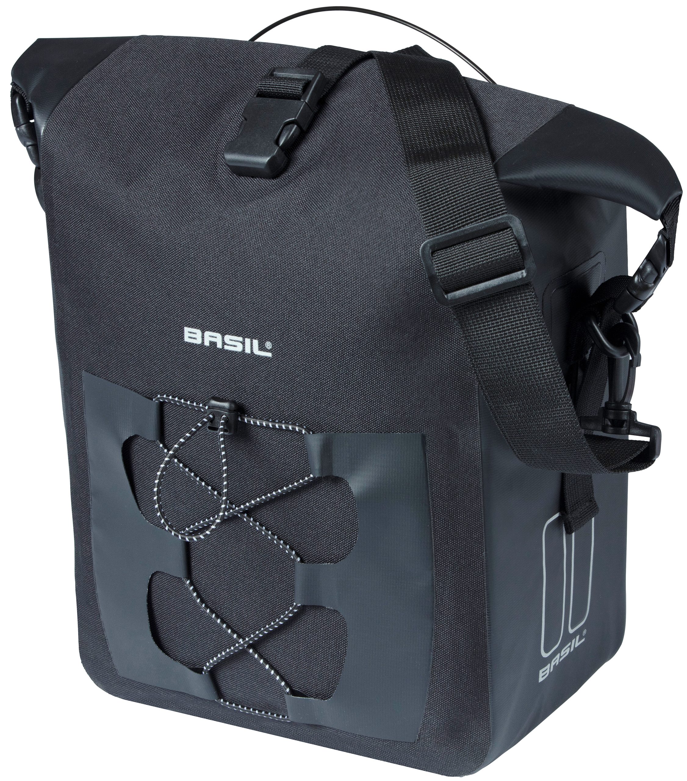 Leg je sportieve lat hoger met de Basil Navigator Waterproof M MIK Studs. 100% waterdicht (IPX 3) en een inhoud van 14 liter maken de enkele fietstas ideaal om mee op pad te gaan. De tas is gemaakt van een combinatie van taurpaulin en 600D polyester en heeft een afneembare en verstelbare schouderband. Jouw helm of natte regenjas opbergen? Aan de voorzijde van de tas zit een reflecterend elastiek. De tas sluit je met een roltopsluiting af. Deze sluiting kun je op twee manieren rollen: naar de achterzijde van de tas of bovenop de tas. De kliksluitingen kun je namelijk flexibel inzetten. Net wat je zelf fijner vindt! Je bevestigt de fietstas met het Basil Hook On systeem aan de fiets. Je kunt de tas extra bevestigen aan de frame van de fiets dankzij het extra instelbare haakje aan de onderzijde van de tas. Ontdek het gemak van MIK- het innovatieve systeem waarmee je snel en eenvoudig fietsaccessoires op je bagagedrager bevestigt en verwisselt. Zo zet je met MIK profiles niet alleen een tas of mand op je drager, maar klik je met MIK Studs ook extra tassen aan de zijkant van je drager. Dit maakt het mogelijk om elke tas in enkele seconden op en van je fiets te halen, zonder moeite en zonder je bagagedrager te beschadigen. Wat heb je hiervoor nodig? Een tas met MIK Studs en een drager met drie montagepunten. Heb je deze drager niet? Geen zorgen! Met de apart verkrijgbare MIK Frame adapter kun je alsnog gebruik maken van dit handige systeem. Zo geniet je van de veelzijdigheid en flexibiliteit die MIK Studs biedt. Eigenschappen: