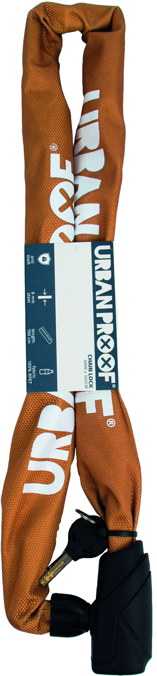 Urban Proof kettingslot is gemaakt van 8mm speciaal gehard staal. Het kettingslot heeft een gerecyclede, beschermende doek dat bestaat uit 100% gerecycled PET materiaal (RPET). Vanwege de slot cilinder anti-diefstal beveiliging kan je jouw fiets overal neerzetten zonder zorgen.